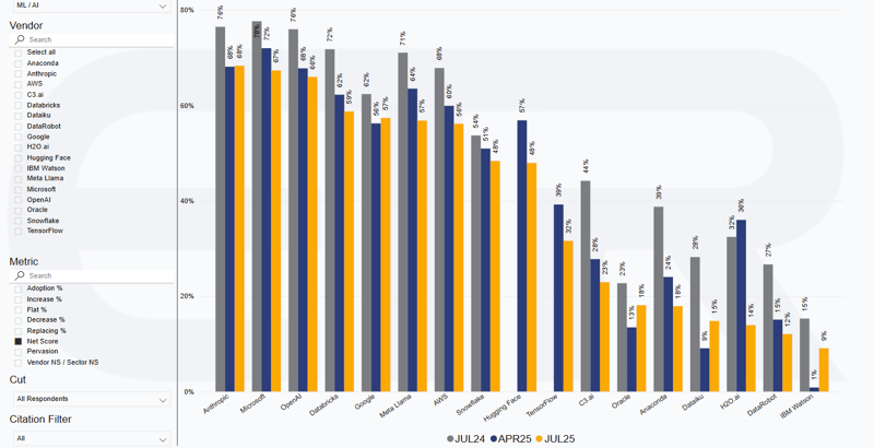 ETR Data: Overtaking Microsoft by 1ppt, Anthropic finds itself leading the ML/AI sector in Net Score, according to preliminary JUL2025 Technology Spending Intentions Survey (TSIS) data. The ML/AI sector still sees the highest average Net Score across all sectors in the survey, but is not impervious to the macroeconomic context, contracting by a relative 16%, or 10ppts, since last year.