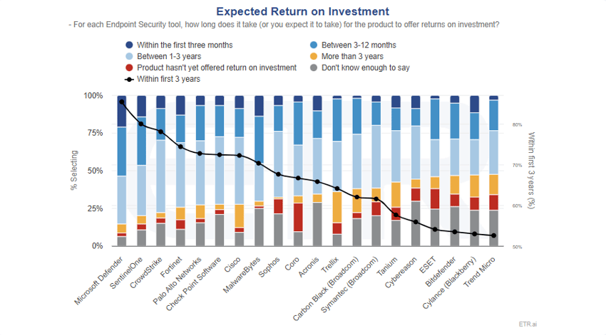 ETR Data: ETR’s most recent Observatory for Endpoint survey showed that Microsoft Defender was the endpoint tool with the fastest return on investment expectation, followed closely by pure-play endpoint vendors SentinelOne and CrowdStrike.