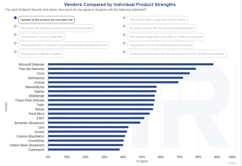 ETR Data: In the illustration above, we view the survey results for which vendors got high marks for product updates. Despite still holding a generally high positioning in the Endpoint Observatory, in this specific measure, CrowdStrike performed well below the peer average. The vendor ranked in the bottom three, with only 40% agreeing that product updates were executed well, a level well below last year’s edition, where 74% of respondents agreed.